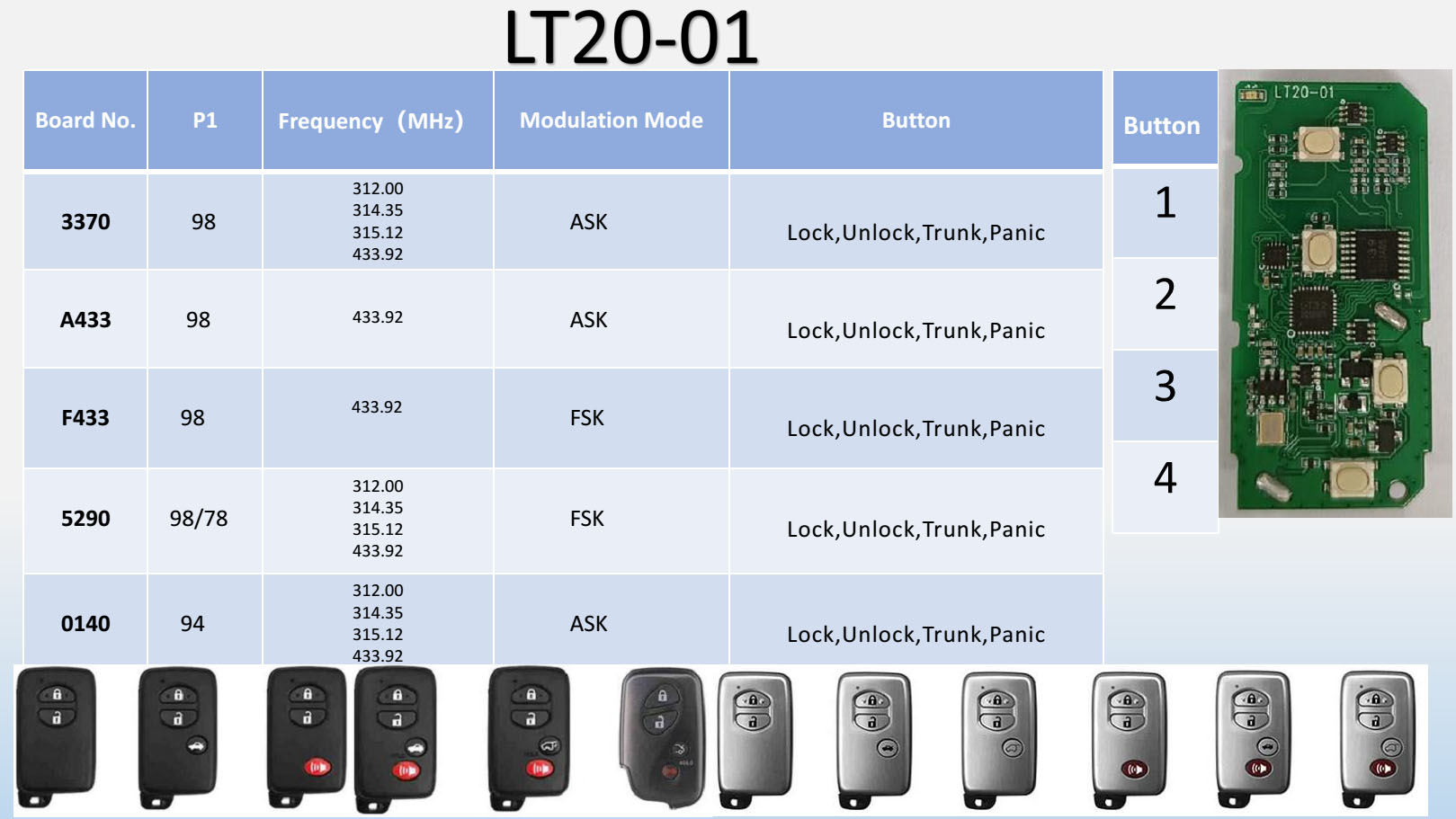 | Pilot można użyć do | Toyota Camry 2006 - 2011 Land Cruiser 2008 Land Cruiser 2010 - 2015 Prado 2006 - 2013 Prius 2010- 2015 Crown 2009 - 2011 Crown 2014 Highlander 2008 - 2010 Highlander 2014 Reiz 2010 - 2011 Lexus IS300C 2009 IS300 2008 IS300 2010 RX350 2011 RX350 2015 GX460 2010 - 2011 GX460 2013 RX270 2009 RX270 2011 - 2015 RX450 2009 RX450H 2015 CT200 2012 CT200 2014 - 2015 CT200H 2012 GS430 2006 GS300 2008 ES240 2010 - 2012 ES250 2008 ES350 2006 - 2009 ES350 2012 |